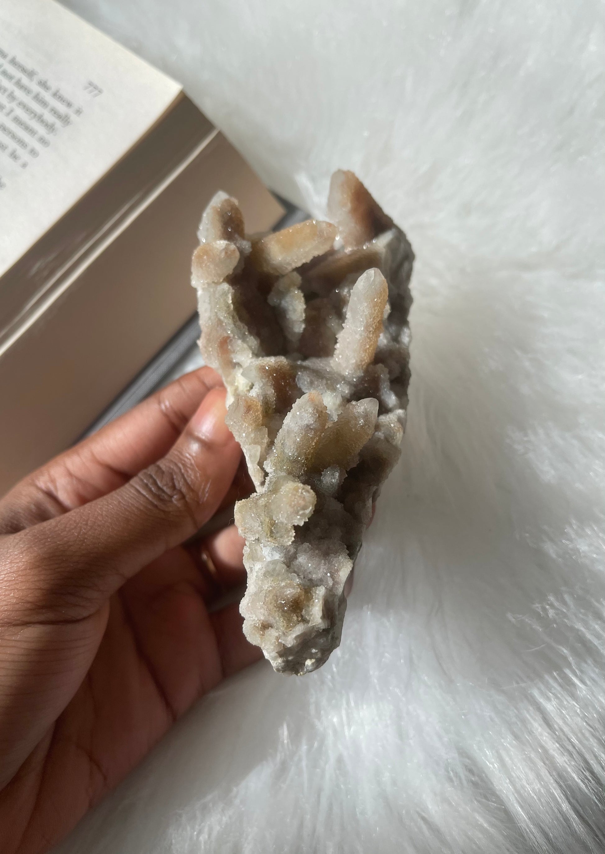 This is young Spirit Quartz, it is also known as fairy finger quartz due to the thin glittery finger like points. Fairy spirit quartz will help promote peaceful connections and communication. Fairy spirit quartz is connected to the crown chakra, it is great for honing intuition and meditation. Ground yourself with Hematoid Quartz after meditating with Fairy Spirit Quartz.
