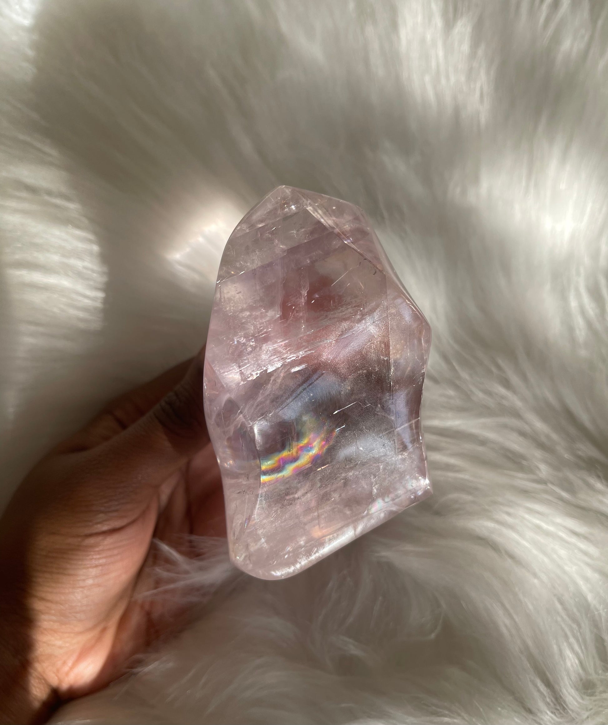 Stunning rainbow filled Icelandic Spar with lavender/lilac colouring polished into a flame shape!