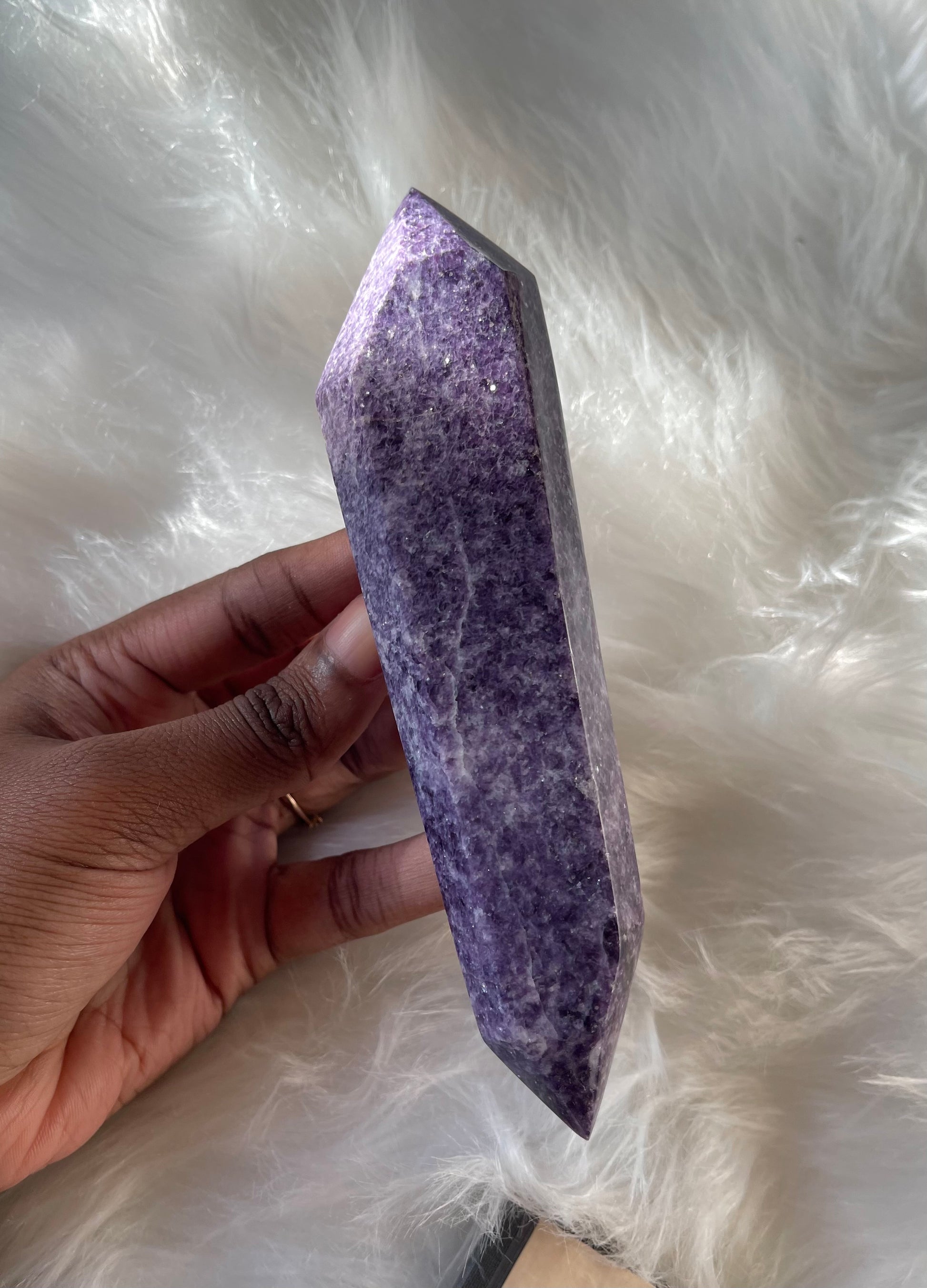 Stunning metallic shimmer throughout the entire stone which is the lithium rich Lepidolite mica.