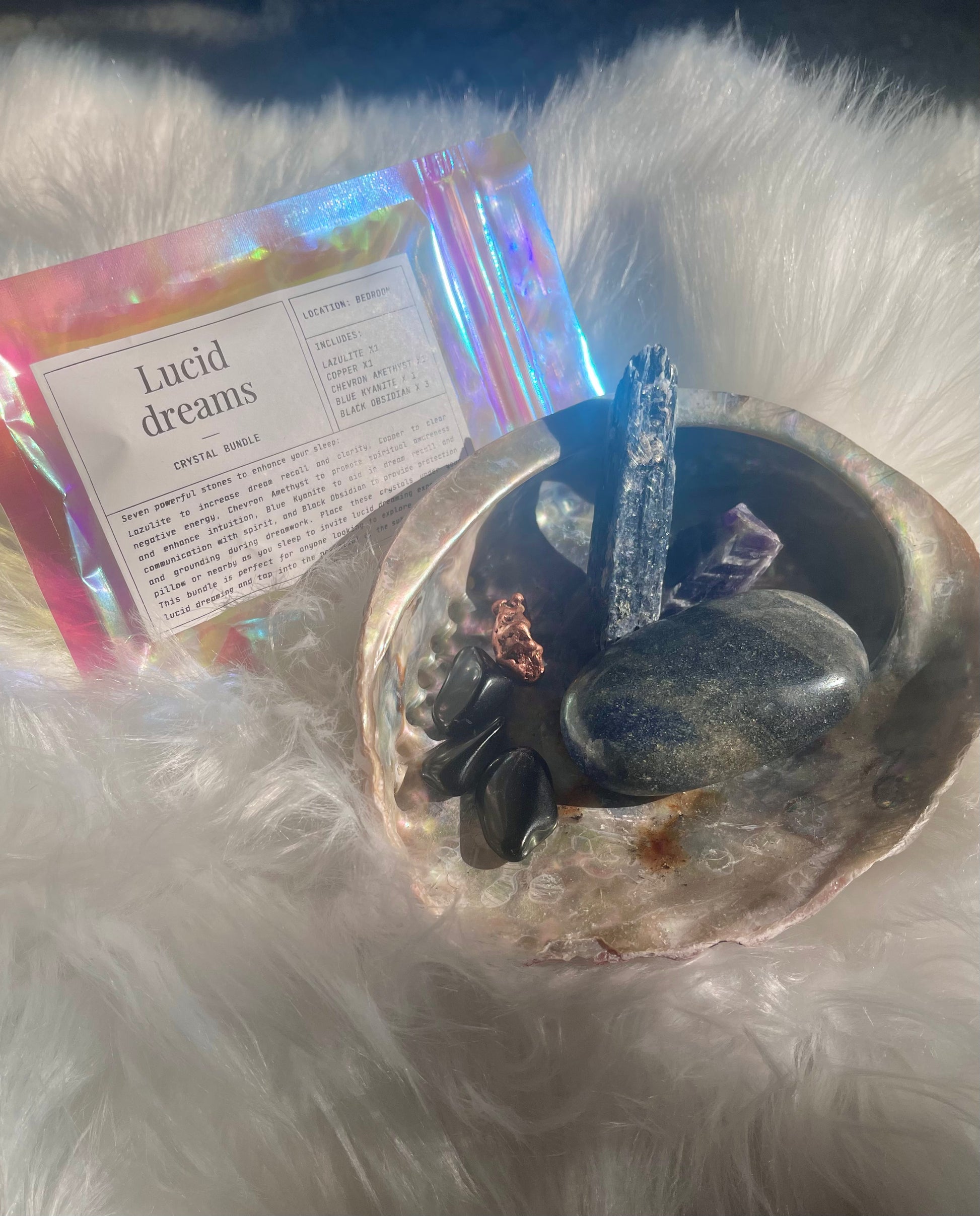 Lazulite to increase dream recall and clarity, Copper to clear negative energy, Chevron Amethyst to promote spiritual awareness and enhance intuition, Blue Kyanite to aid in dream recall and communication with spirit, and Black Obsidian to provide protection and grounding during dreamwork. Place these crystals under your pillow or nearby as you sleep to invite lucid dreaming experiences. This bundle is perfect for anyone looking to explore the world of lucid dreaming and tap into the potential of the subconscious mind.
