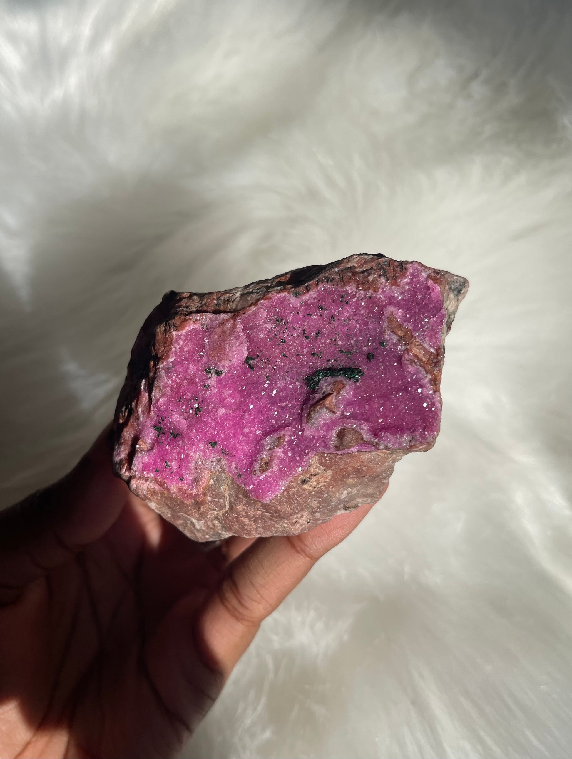 Pink Cobaltoan Dolomite is a beautiful unique stone. It has a naturally pink glittery colour and this is due to the cobalt inclusion in the mineral. Pink Cobaltoan Dolomite is also commonly known as Pink Calcite or Cobalt Calcite however it is actually Pink Dolomite! The green inclusion is Malachite!